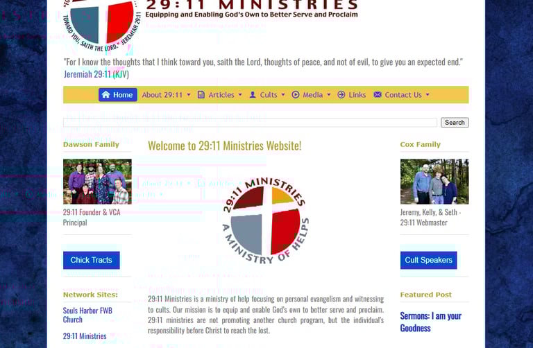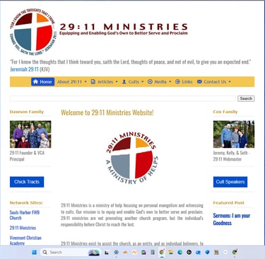 29:11 Ministries is a ministry of help focusing on personal evangelism and witnessing to cults. Our mission is to equip and enable God’s own to better serve and proclaim. 29:11 ministries are not promoting another church program, but the individual’s responsibility before Christ to reach the lost.